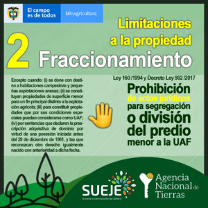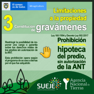 Los predios de origen público adquiridos por los programas de acceso a tierras del Estado están sujetos a las limitaciones para Disposición (venta), Fraccionamiento (división), Constitución de gravámenes (hipoteca) y Concentración (acumulación), por ello según el programa de acceso por el que se hayan adjudicado requieren autorización de la ANT.